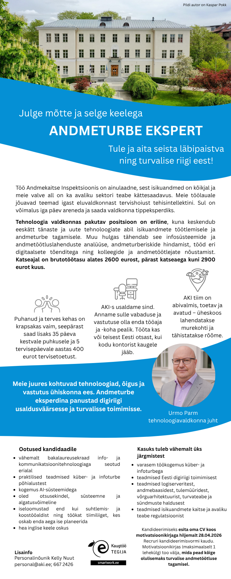 Andmekaitse Inspektsiooni eesmärk on aidata kujundada ühiskonda, kus väärtustatakse üksikisiku õigust eraelule ja riigi tegevuse läbipaistvust. Tegutseme selle nimel, et Eestis oleks läbipaistev ja turvaline digiühiskond, kus teadlikud inimesed ja vastutustundlikud andmetöötlejad teevad läbimõeldud otsuseid. Seetõttu tegeleme igapäevaselt nii infotehnoloogiliste kui õigusalaste küsimustega.